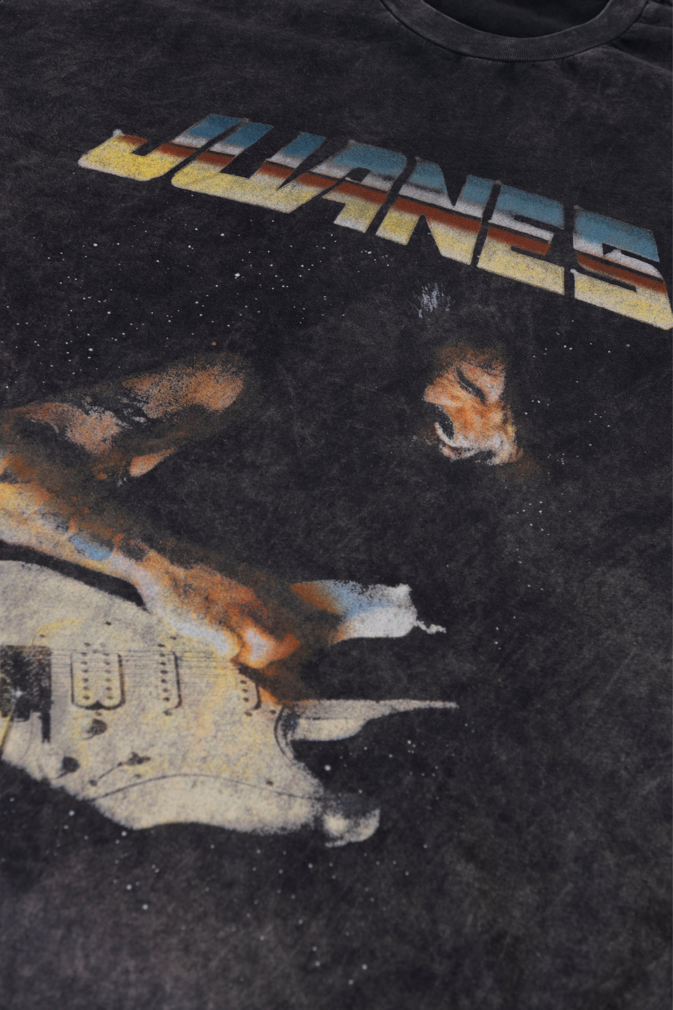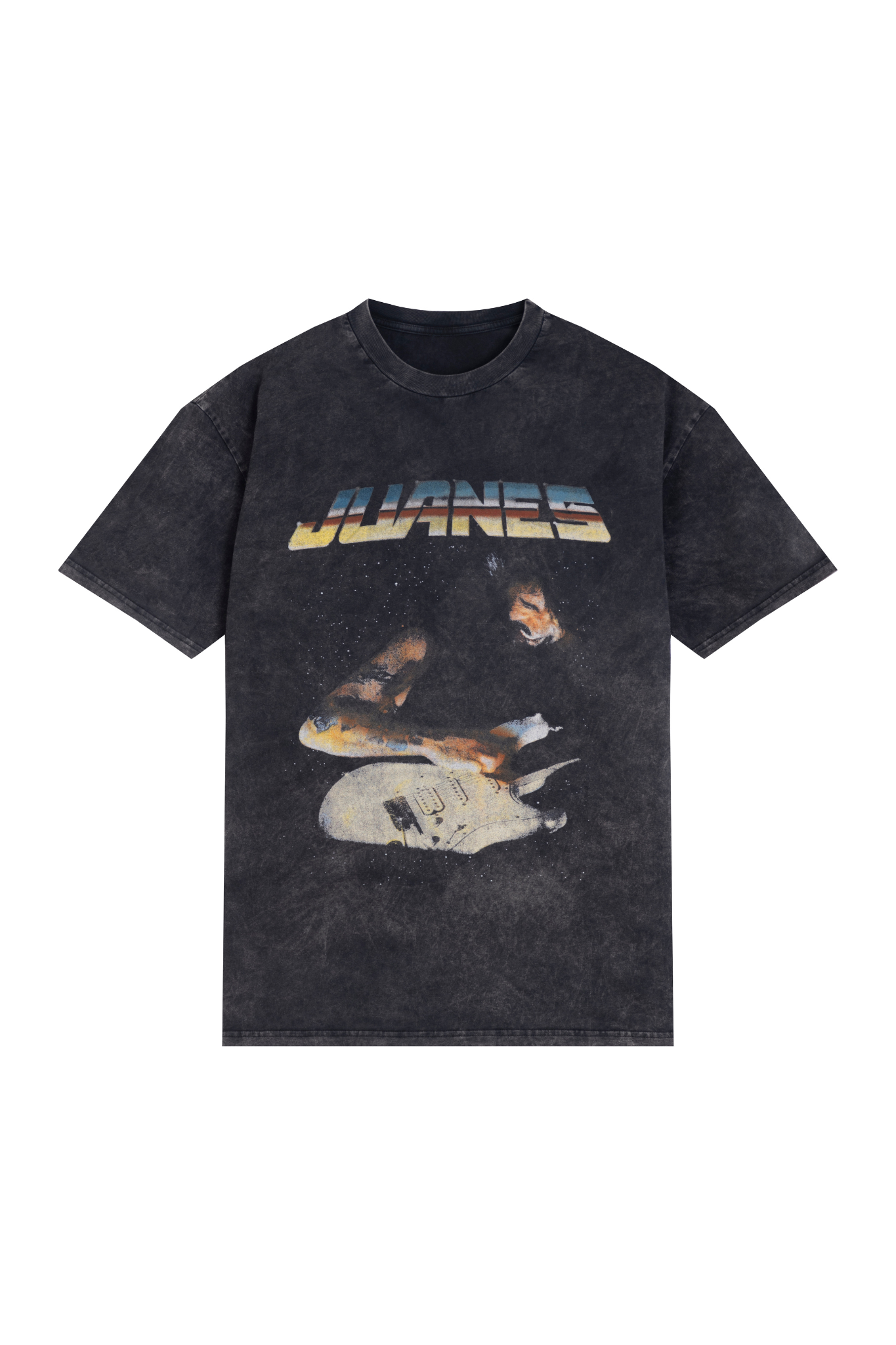 Camiseta fit regular con cuello en rib y estampado en serigrafía con glitter. 100% algodón y lavado acid wash vintage.